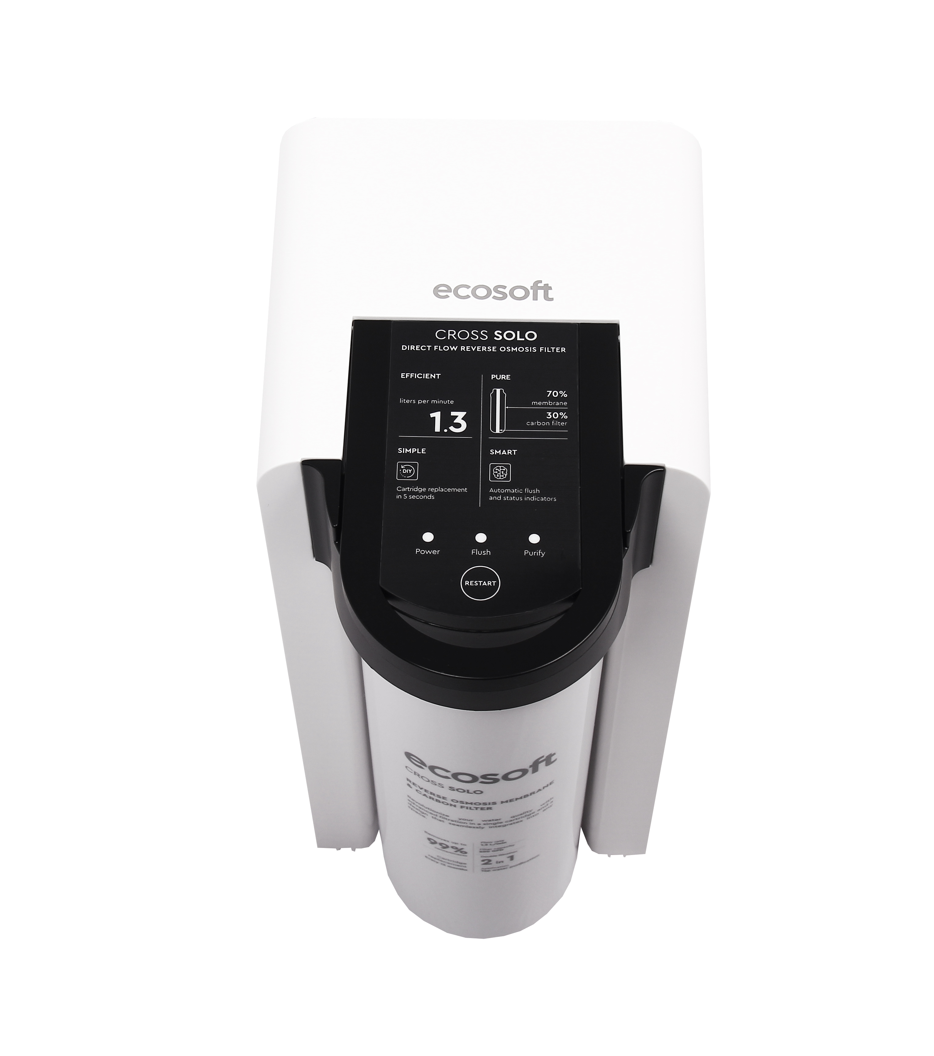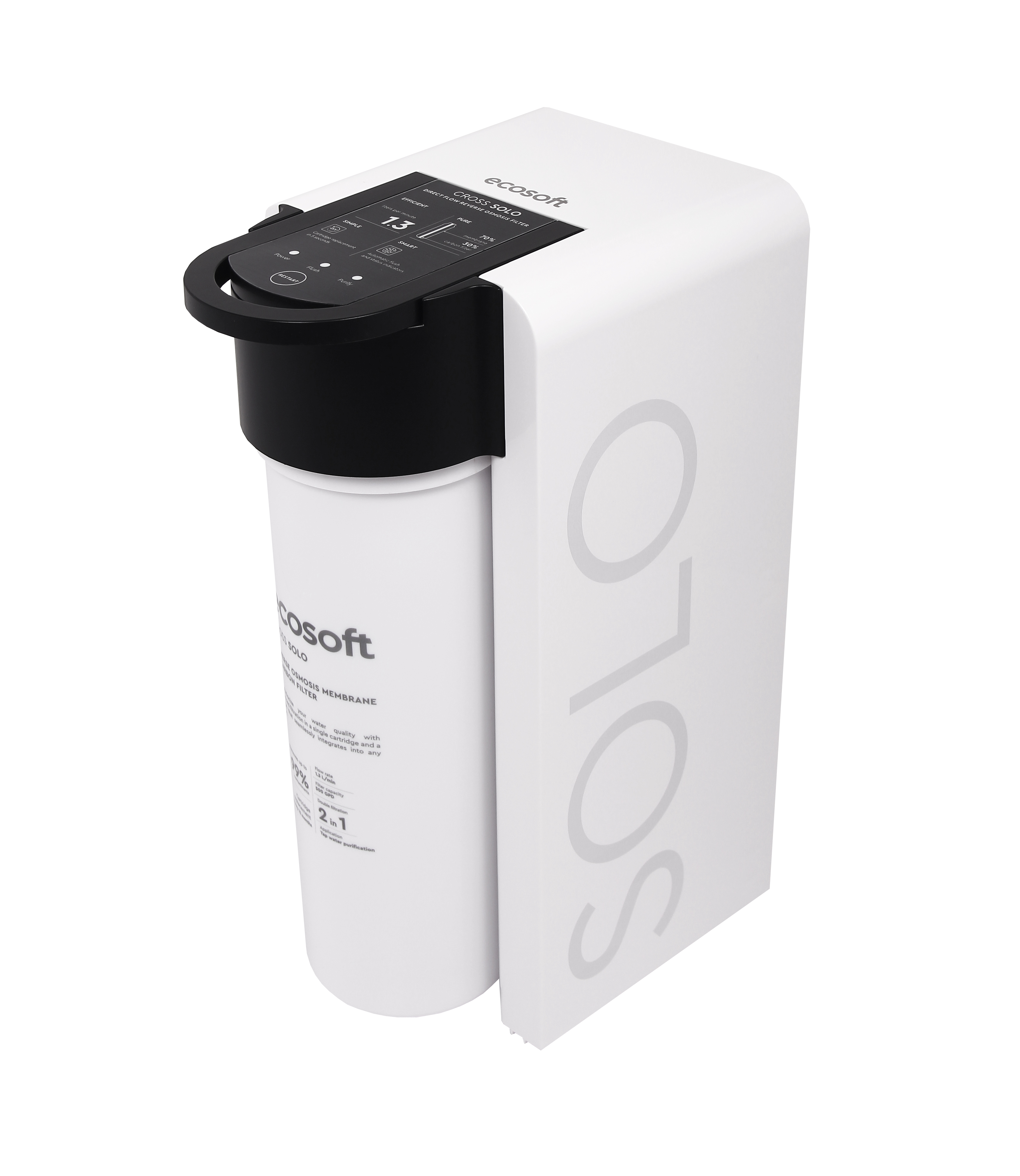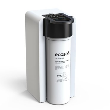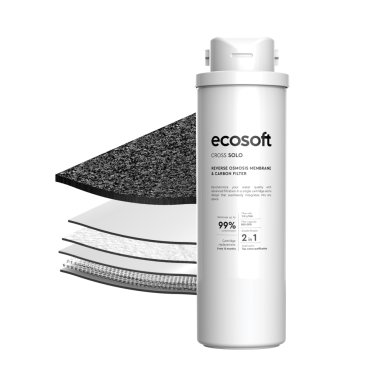 ECOSOFT Cross Solo uses advanced reverse osmosis technology to ensure high-quality water purification. The system operates with a 2-in-1 replacement filter that combines an RO membrane and coconut-based carbon filtration, removing up to 99% of contaminants, including bacteria, viruses, and PFAS.