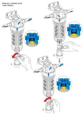 The filter is flushed when pressure losses occur. It can be monitored with installed manometers before and after the filter. The transparent housing makes it easy to assess the degree of contamination.