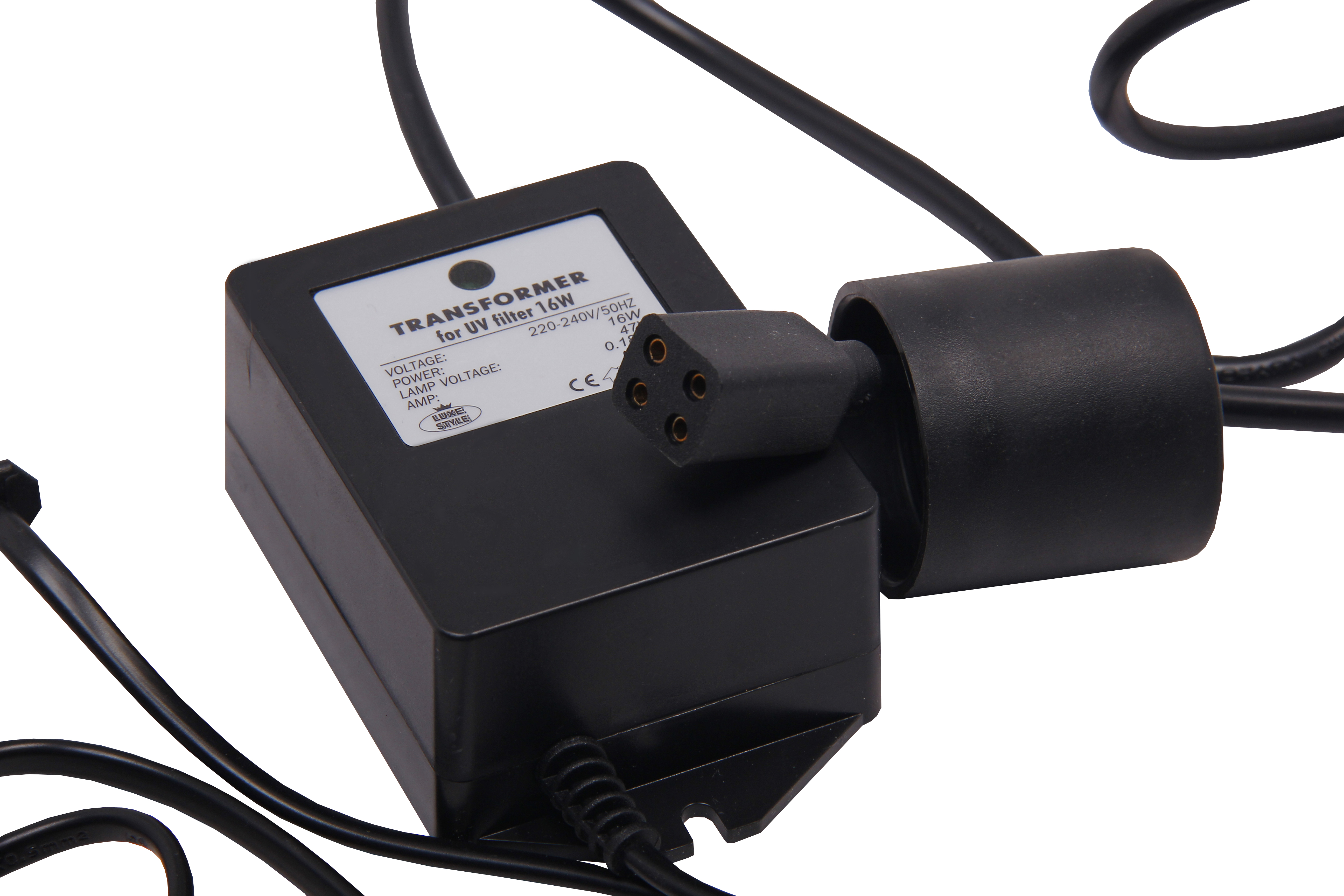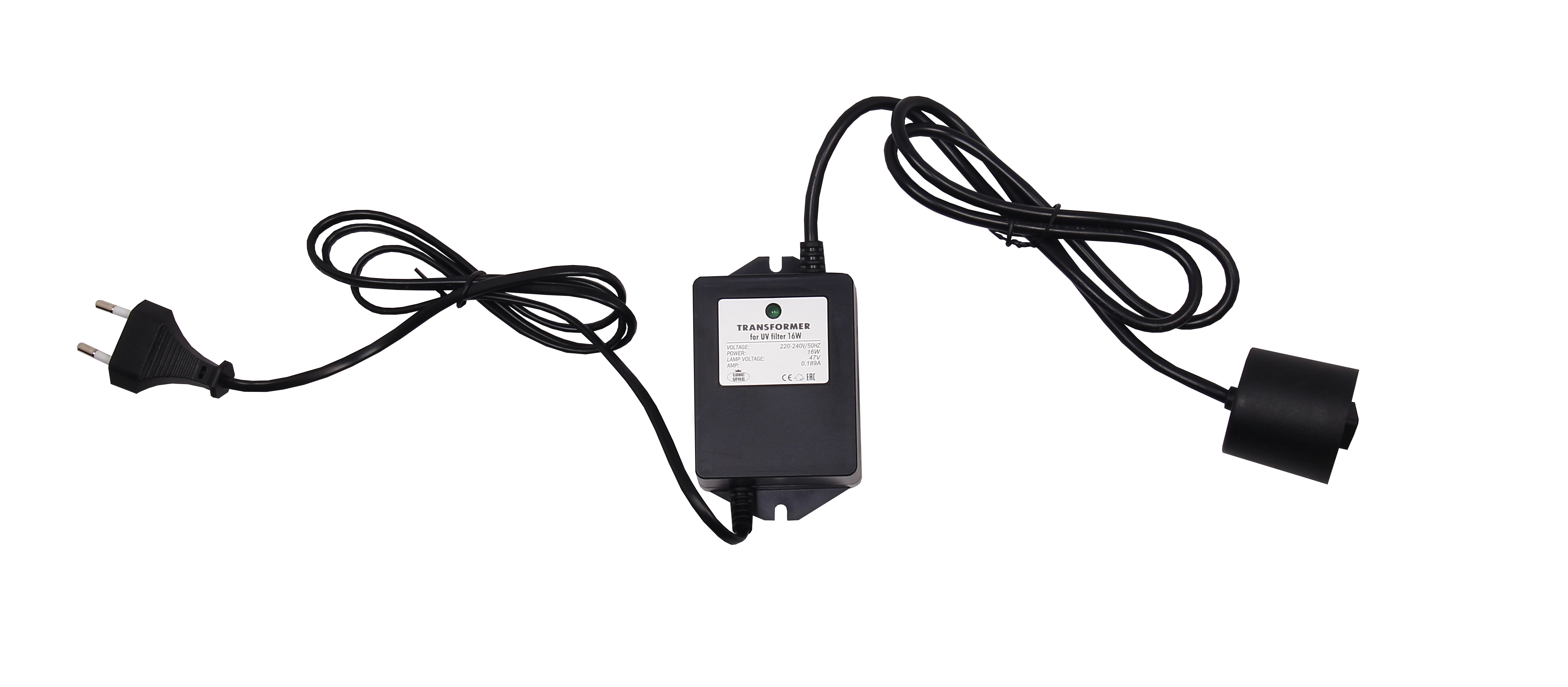 Input – 230 V AC. Output – for 16 W UV lamp. Indoor use only.