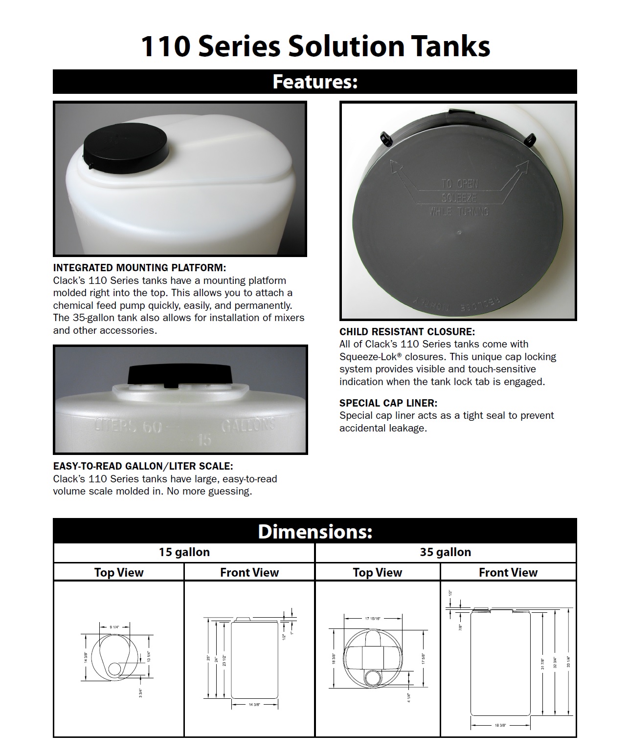 Available in several colors, Clack’s 110 Series Solution Tanks are designed with 110 mm openings for easy access and convenient filling. The wide diameter openings also allow adequate clearance to reach inside for assembly of fittings.