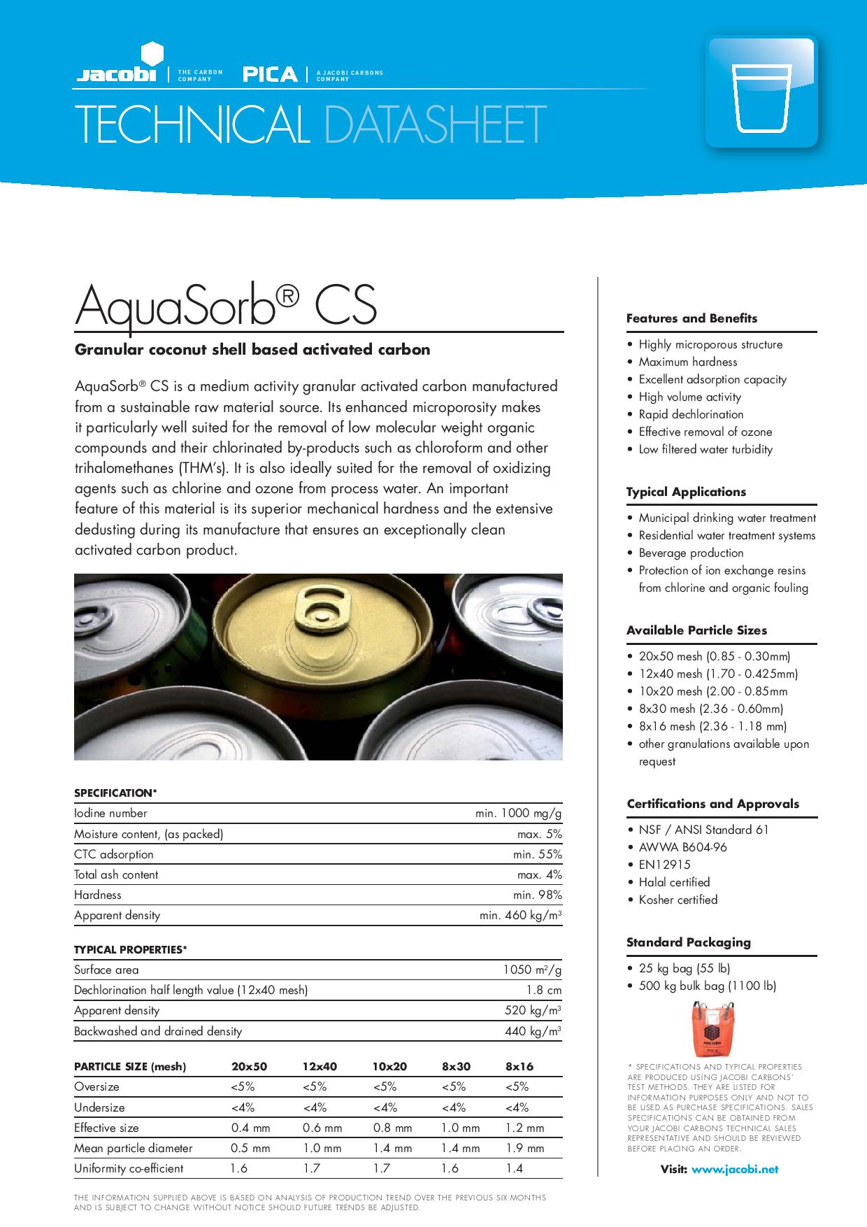 „AquaSorb® CS“ yra vidutinio aktyvumo granuliuota aktyvuota anglis, pagaminta iš tvaraus žaliavos šaltinio. Dėl padidinto mikroporingumo ji ypač tinka mažos molekulinės masės organiniams junginiams ir jų chloruotiems šalutiniams produktams, tokiems kaip chloroformas ir kiti trihalometanai (THM), šalinti. Ji taip pat idealiai tinka oksidatoriams, tokiems kaip chloras ir ozonas, šalinti iš technologinio vandens. Svarbi šios medžiagos savybė yra didelis mechaninis kietumas ir intensyvus dulkių šalinimas gamybos metu, užtikrinantis išskirtinai švarų aktyvuotos anglies produktą.