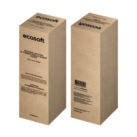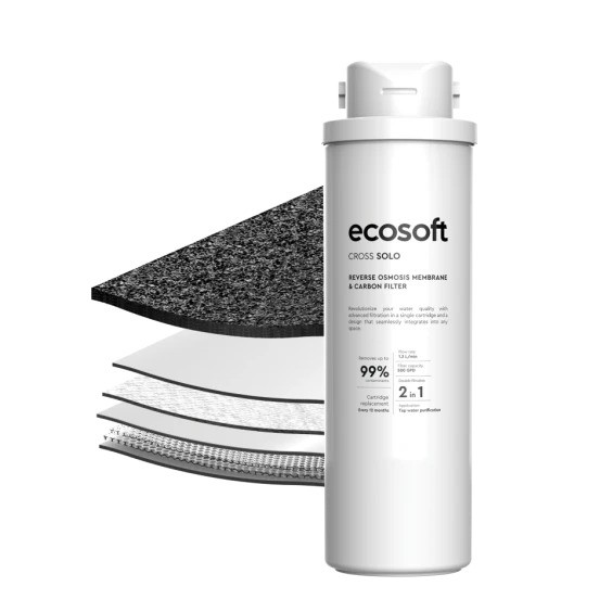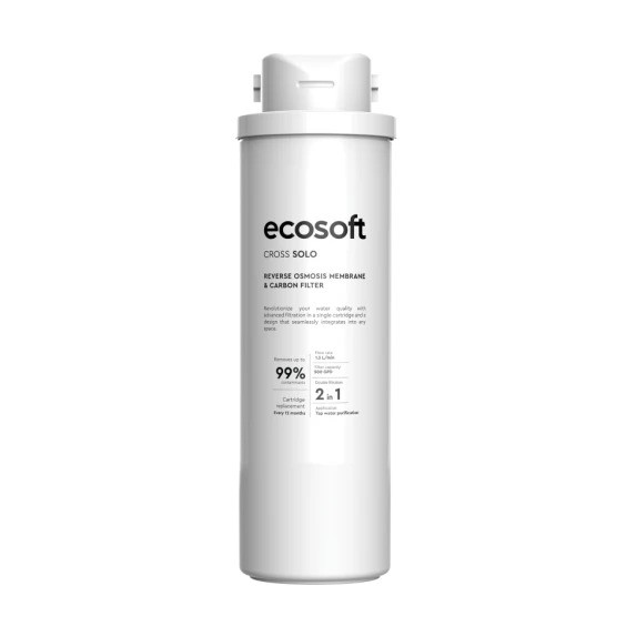 Aukštos kokybės keičiamoji kasetė, specialiai sukurta ECOSOFT CROSS Solo sistemai, užtikrina efektyvų ir patikimą geriamojo vandens valymą. 2-in-1 konstrukcija sujungia atvirkštinio osmoso membraną ir aktyvintos kokosų anglies post-filtrą, pašalindama iki 99 % teršalų — bakterijas, virusus, PFAS, sunkiuosius metalus, chlorą ir organinius junginius.