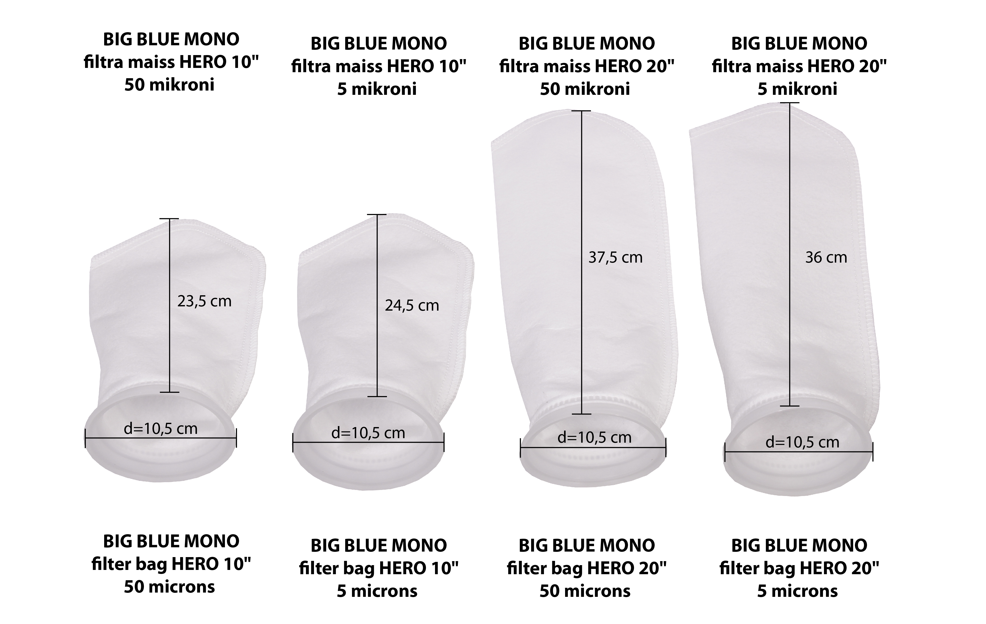 „Atlas Filtri“ Hero filtro maišai siūlomi su skirtingais filtravimo lygiais ir, naudojant specialų BIG BLUE MONO filtro krepšeli HERO, gali būti montuojami į BIG BLUE MONO korpusus. Galimi lygiai: 1, 5, 50 mikronų, kad sulaikytų skirtingo dydžio nuosėdas (molis, dumblas, smulkios dalelės ir kt.). Maišai pagaminti iš polipropileno audinio; maks. darbinė temperatūra 45 °C (113 °F), min. 4 °C (39,2 °F).