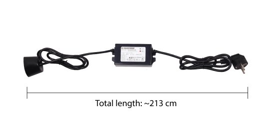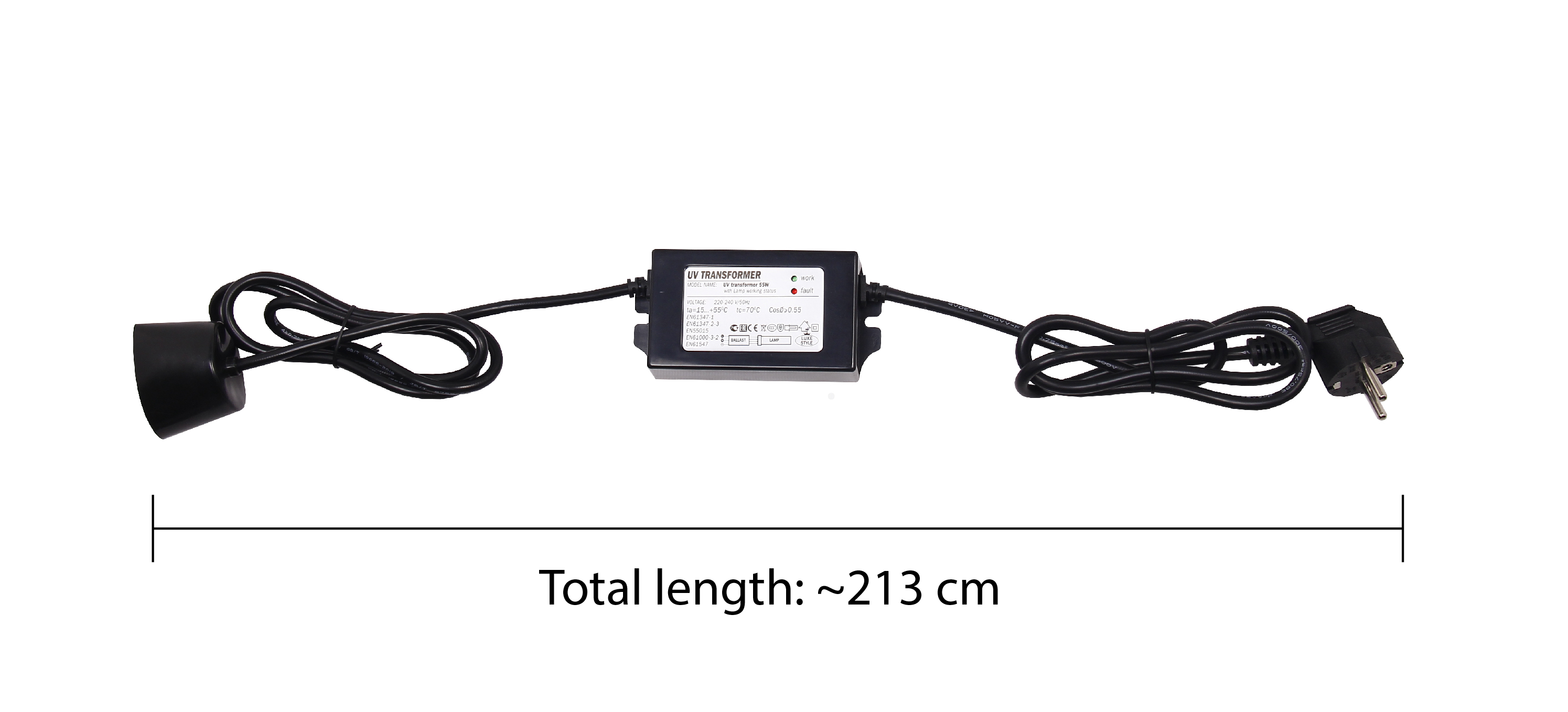 Pievads – 230 V AC. Izvads – 55 W UV lampai. Tikai iekštelpām.